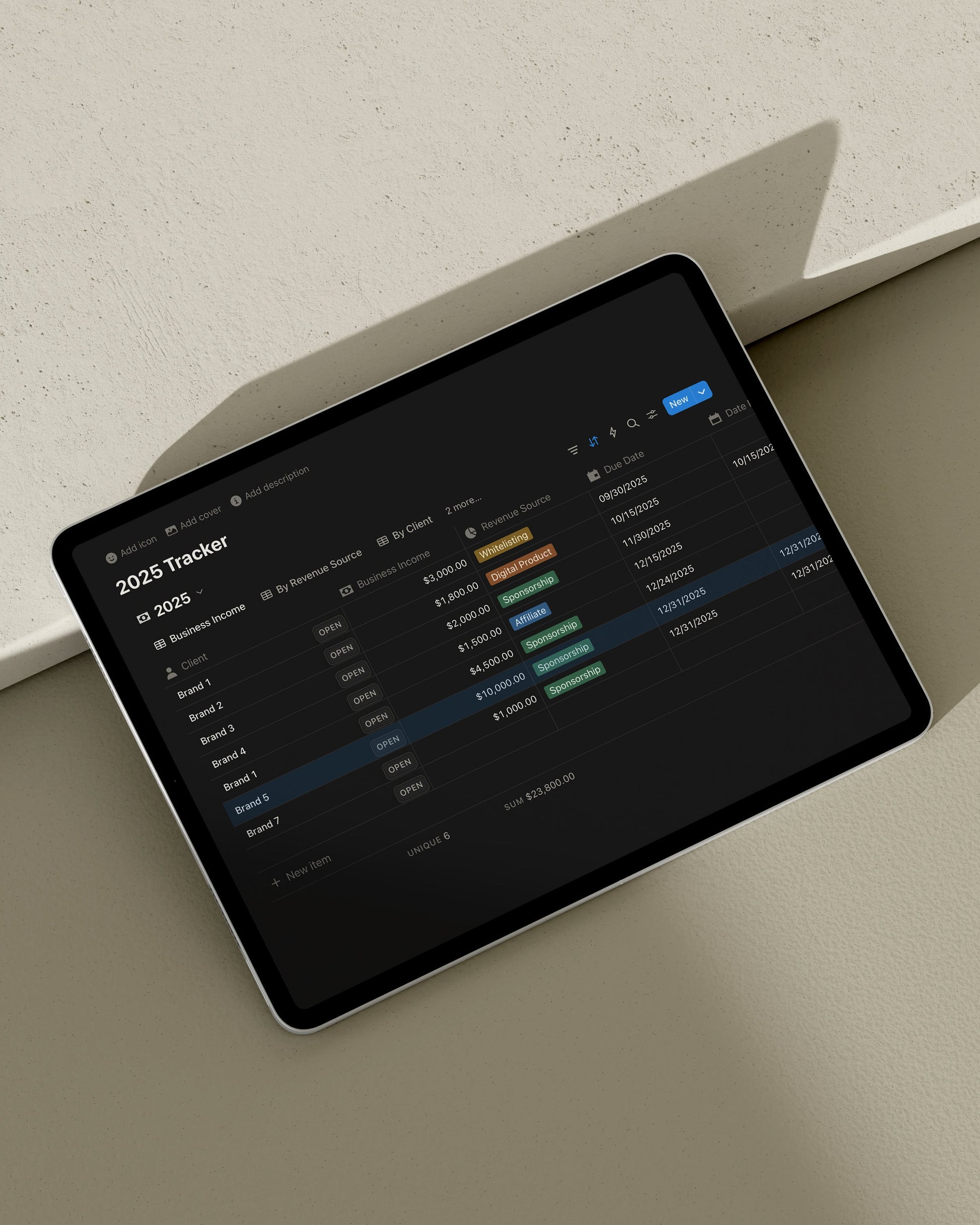 Designed specifically for creatives, freelancers, side-hustlers, and digital entrepreneurs, this clean, intuitive system helps you track every brand collaboration, client project, affiliate payout, and digital product sales — all in one place!